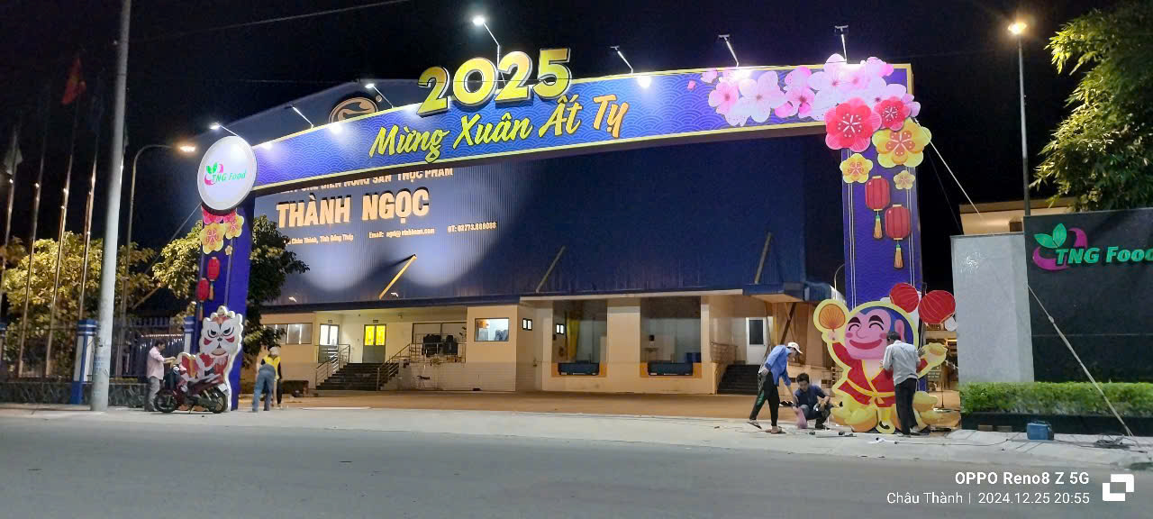 Cho thuê, thi công cổng chào xuân của công ty Vĩnh Hoàn 2025 tại Châu Thành, Đồng Tháp